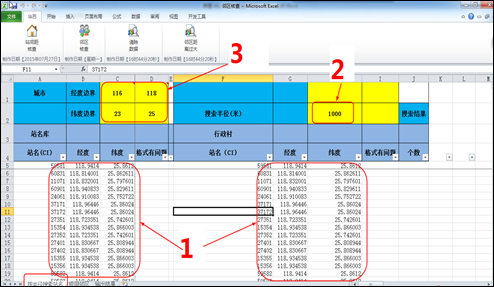 a、數(shù)據(jù)粘貼完成及手動設(shè)置半徑后,點擊圖5中的1【站間距核查】,等待一會兒輸出結(jié)果如圖5中的2,其中2有個別單元格的顏色為紅色,表示該站點與同行的F列中的站點共站,無填充顏色的單元格表示該站點與同行F列中的站點在設(shè)置的半徑范圍內(nèi);