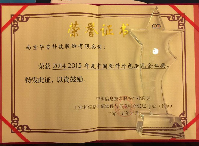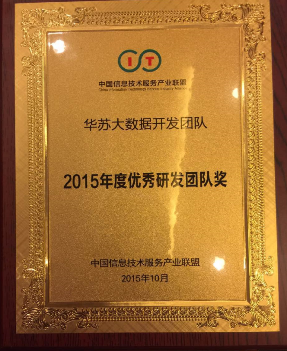 熱烈慶祝華蘇榮獲”2014-2015年度中國軟件外包示范企業(yè)獎(jiǎng)“,研發(fā)大數(shù)據(jù)團(tuán)隊(duì)榮獲“2015年度優(yōu)秀研發(fā)團(tuán)隊(duì)獎(jiǎng)”