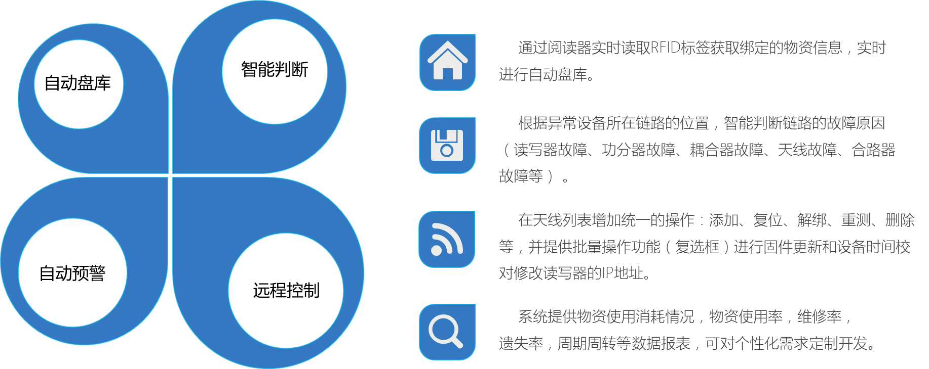 自動(dòng)盤(pán)庫(kù):通過(guò)RFID標(biāo)簽信息讀取,自動(dòng)識(shí)別和盤(pán)點(diǎn)室分資產(chǎn),實(shí)現(xiàn)室分資產(chǎn)無(wú)人化盤(pán)點(diǎn),提高資產(chǎn)盤(pán)點(diǎn)效率。
