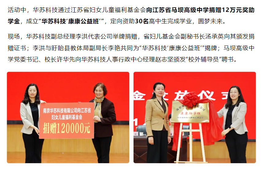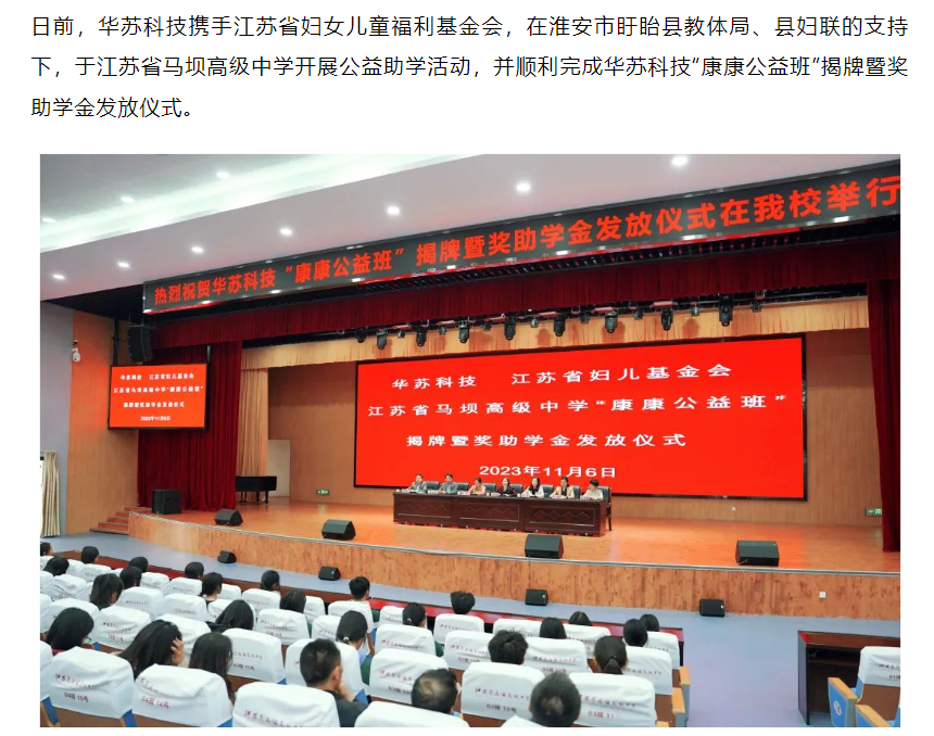 并順利完成華蘇科技“康康公益班”揭牌暨獎助學金發放儀式。