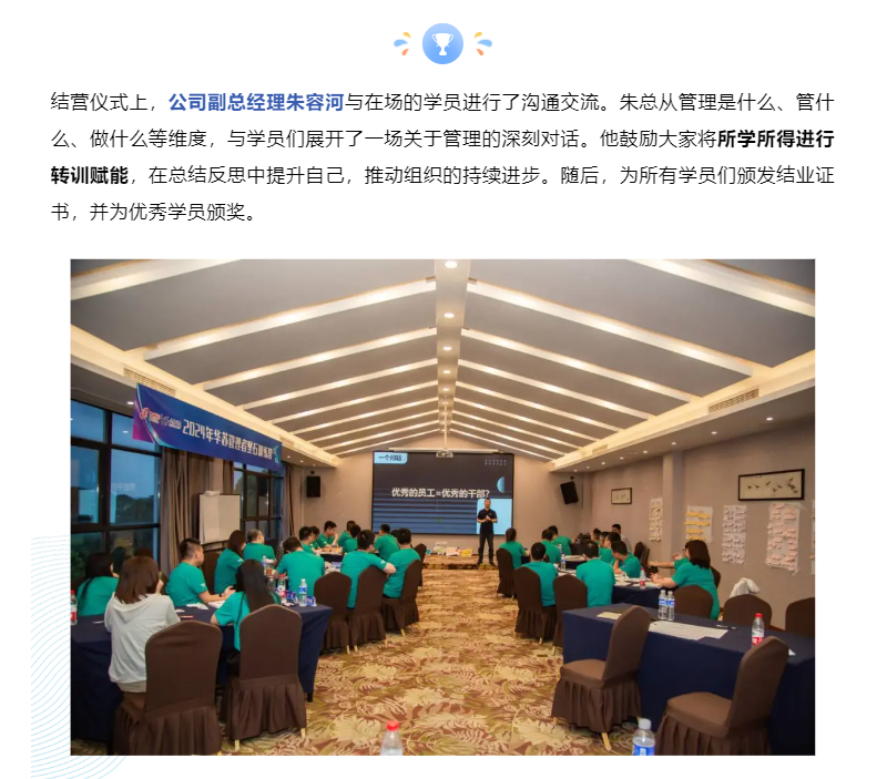 公司副總經理朱容河、李洪出席結營儀式,頒發結業證書并為優秀學員頒獎。
